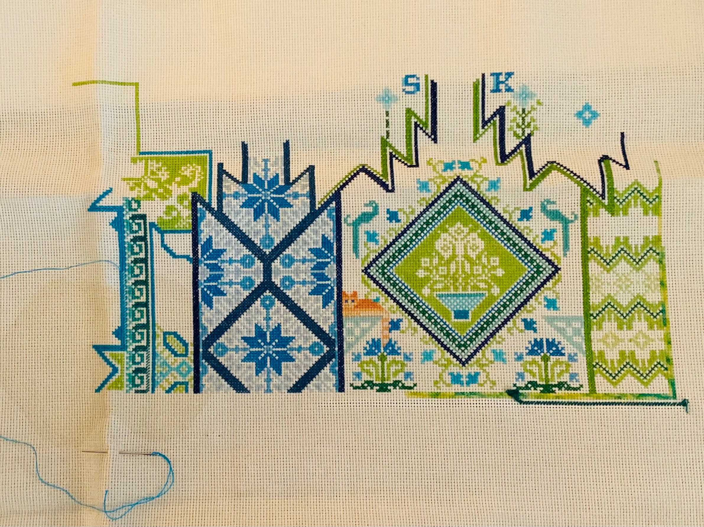 The battery on my laptop died, so I had to purchase a new computer. I got a really fancy new iPad. It has a separate keyboard, and a huge hard drive, At first I didn’t think I’d be able to retrieve anything from my laptop, but God has been resurrecting the battery at different times, so when that happens, I get the things I want and send them to myself in assorted emails. It’s been working quite well. There were a number of Long Dog Sampler charts that I had saved on my hard drive, that I needed, so I was able to send those to myself, plus some of the things I need so I can finish the sampler I’m working on (it’s called Pandemic, and it’s also a Long Dog Sampler design).